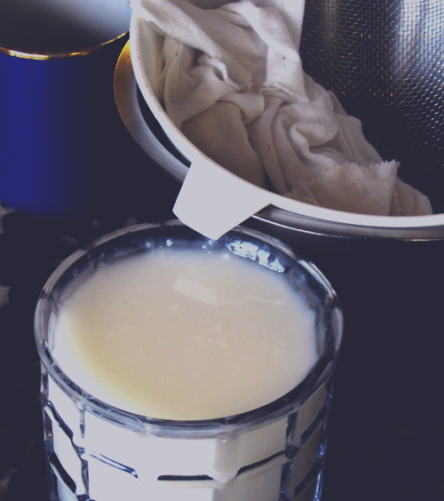 Pour milk onto cloth-covered sieve in small batches, stirring constantly to help strain through the milk. It will take about five minutes. You’ll be left with rice milk in the bowl, and rice meal** in the sieve.