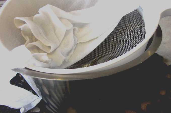 My milk straining station! I just cut up an old threadbare white t-shirt to use as a strainer; the feet of plain nylon stockings will work perfectly if, unlike me, you can be bothered buying a pair, and will also remove the risk of overflow that comes with using a square of fabric