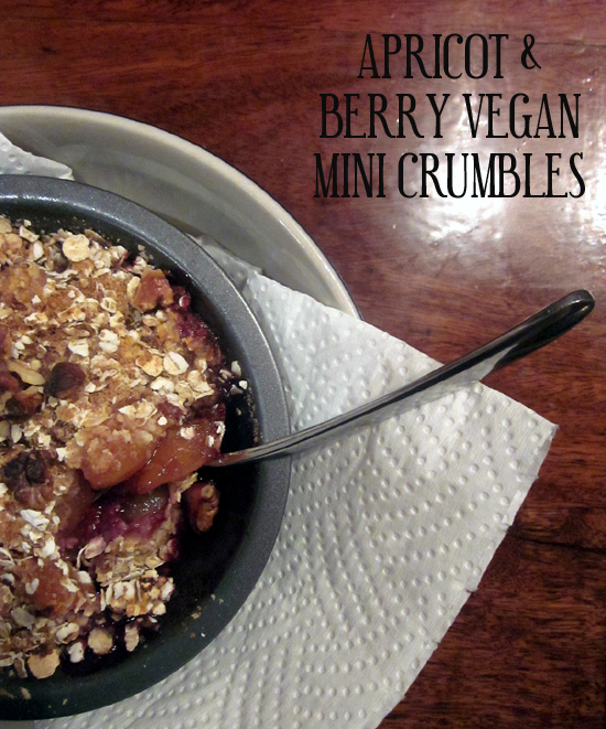 This recipe makes two mini crumbles, enough for you and one lucky other; if you are cooking for a handful of people, triple the recipe and bake it up in a 9″ pie dish. To change things up a little, try using peaches instead of apricots. Strawberries and boysenberries would be a great substitute for raspberries and blueberries. If you don’t have any berries to hand, throw some very thinly sliced apple into the mix.