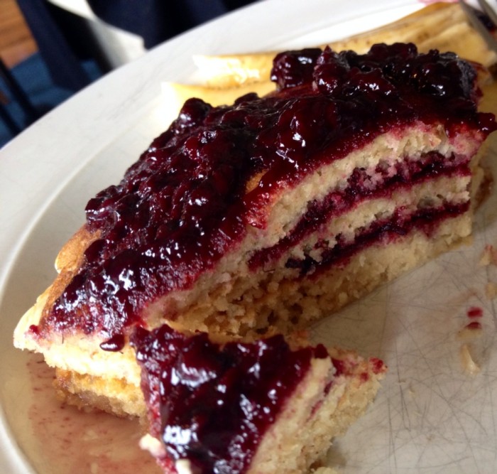 I have included a recipe for an effortless two-step boysenberry sauce that tastes like you spent a whole lot more time tending to it. Stack the pancakes, with a spoonful of sauce between each layer and a few big dollops on top.